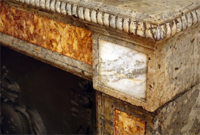 Récemment restaurée, cette cheminée emploie plusieurs pierres calcaires régionales polies complétées par du marbre blanc d’Italie. La pierre rose extraite dans le Haut-Jura est identique à celle employée pour les cheminées du grand salon voisin. La plaque de cheminée, aux armes du roi complétées par des chutes de laurier, présente la date d’achèvement du palais de l’Intendance, 1777.