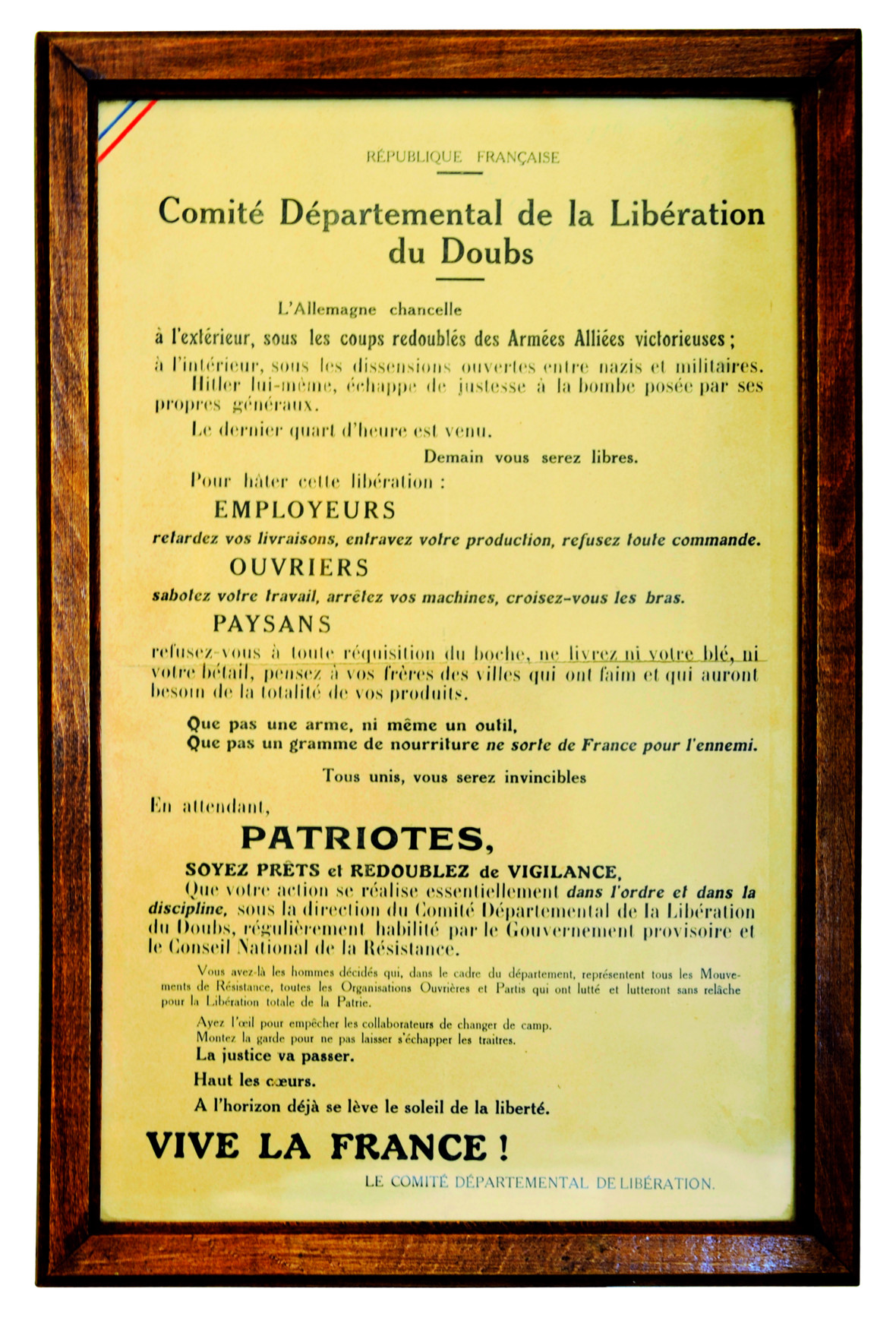Au mur, vous pouvez observer une affiche du Comité départemental de Libération du Doubs rédigée dans l’été de 1944 et qui vous permet de découvrir les différents conseils donnés à la population dans cette situation difficile de notre histoire. Besançon a été libérée par les troupes américaines le 8 septembre 1944.