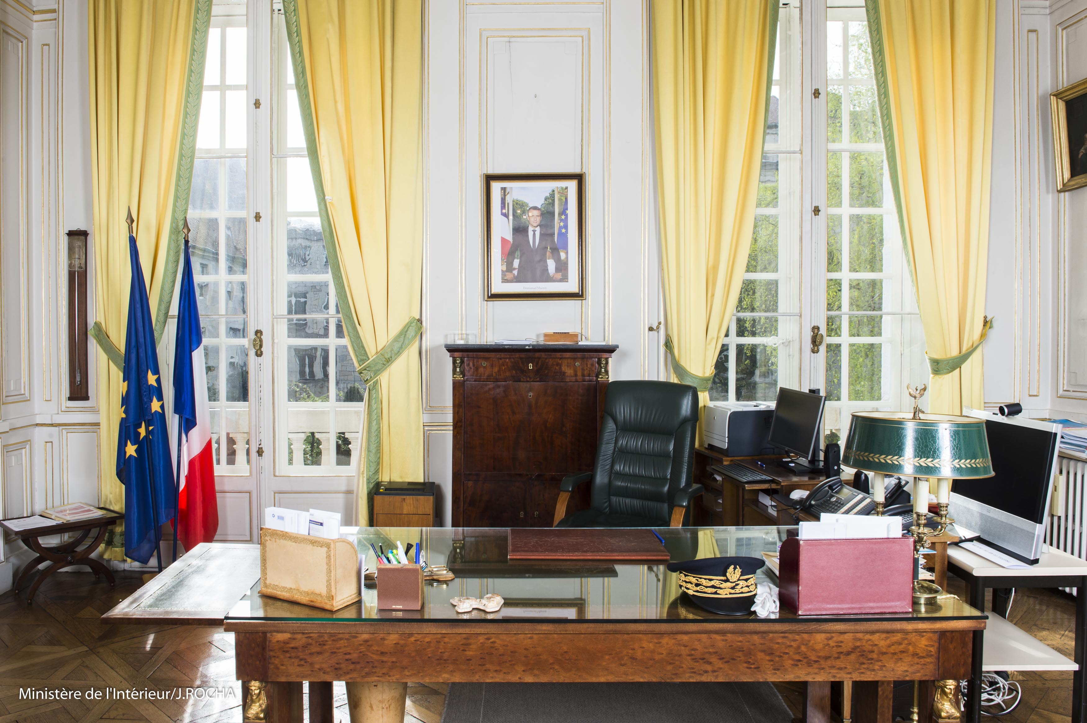 Placée dans l’angle de l’édifice du côté des jardins, cette pièce est très lumineuse. Nommée bibliothèque ou grand cabinet de travail au XVIIIe siècle, ce bureau est celui des préfets successifs depuis 1800. Des bibliothèques, réelles et feintes, composent l’un des côtés de la pièce. Quatre grisailles peintes et trois trophées allégoriques sculptés décorent la pièce. Sur la cheminée en pierre polie de Franche-Comté, la présence du laurier est une discrète évocation du pouvoir.