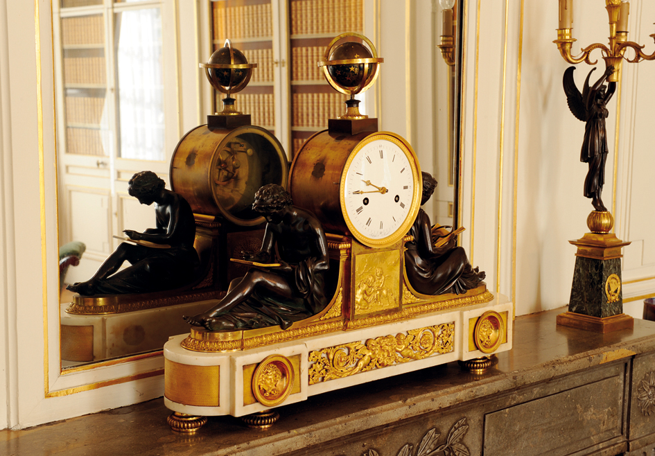 Cette pendule est un exemplaire d’un célèbre modèle créé à partir des sculptures de Louis‑Simon Boizot faites en 1776 pour la Manufacture royale de Sèvres, « jeune fille lisant » et « jeune homme écrivant », plus connues sous les noms de l’Etude et la Philosophie. C’est le marchand-mercier Dominique Daguerre qui eut l’idée de les utiliser pour faire des bronzes dont il confia la réalisation à François Rémond afin d’en faire une pendule d’un genre nouveau à partir de 1784. Outre la famille Royale, les plus hauts dignitaires de l'époque possédaient ce type de pendule.